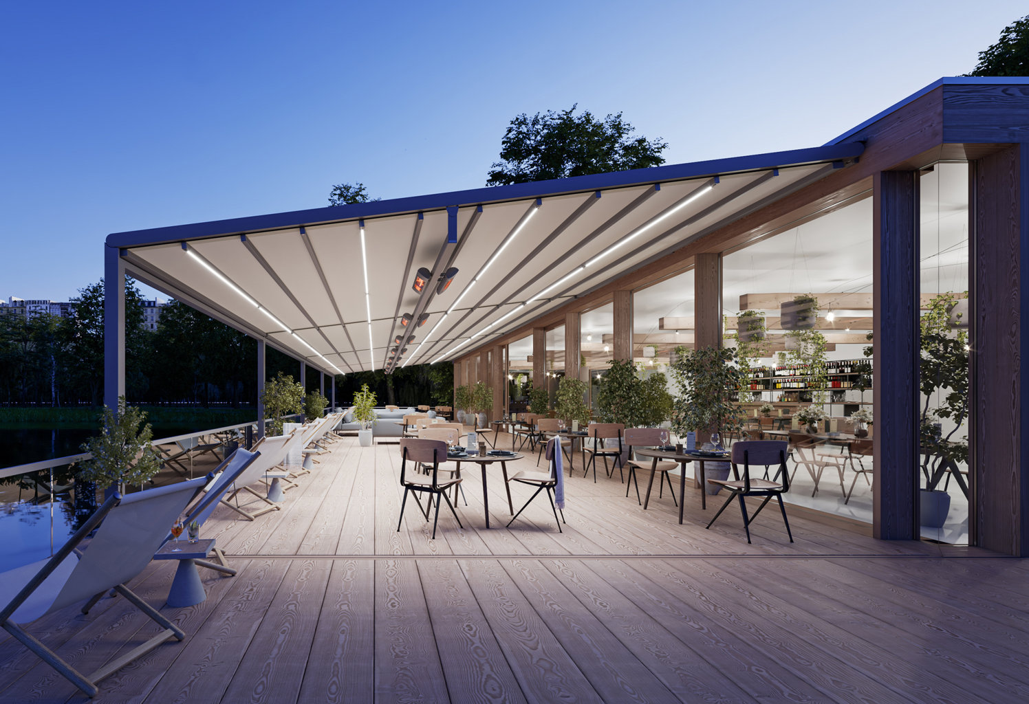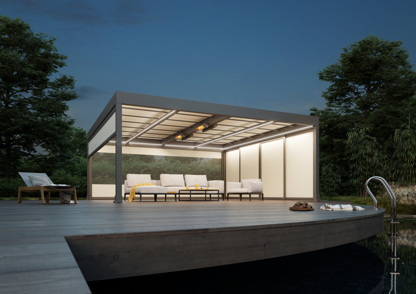 E la sera, quando il sole si ritira, le pergole markilux continuano ad essere luminose.