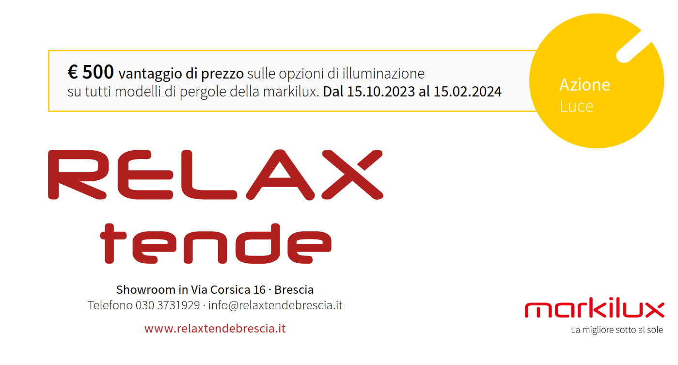 La promozione con sconto di Euro 500 sulle opzioni di illuminazione è valida per acquisti di pergole markilux entro il 15 febbraio 2024.